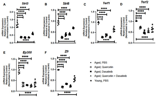 Human studies have demonstrated that increased levels of sirtuin 3 (Sirt3) have been associated with frailty in older persons while overexpression of sirtuin 6 (Sirt6) has been shown to inhibit the inflammatory senescence-associated secretory phenotype (SASP) [38,39]. When compared to aged control lung, there was a significant decrease in Sirt3 and Sirt6 expression observed in response to senolytic treatment (Figure 4A,B). We next examined the impact of senolytic treatment on genes associated with telomere attrition. Previous work has demonstrated that long-term overexpression of telomeric repeat binding factors (TERF) 1 and 2 can result in progressive telomere shortening [40]. When compared to PBS-treated lung, there was a decrease in Terf1 and Terf2 expression observed in aged lung in response to senolytics (Figure 4C,D). We next examined the potential contribution of senolytics on the expression of DNA binding and transcriptional regulators, such as E1A-binding protein p300 (EP300) and zinc finger RNA-binding protein (ZFR), in aged lung. Previous work has demonstrated a slight increase in EP300 histone acetyltransferase activity in young and aged murine lung [41]. In response to Q, D, and Q + D treatment, we observed a significant decrease in Ep300 expression (Figure 4E). Similarly, the expression of Zfr was also decreased in aged lung in response to senolytic treatment (Figure 4F).