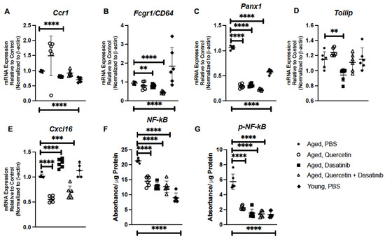 We evaluated if senolytic treatment of aged mice might contribute to changes in inflammatory gene expression in aged lung. Previous work has demonstrated age-associated changes in chemokine receptor CCR1 expression [42]. As CCR1 is critical for neutrophil recruitment, we quantified Ccr1 gene expression in PBS- and senolytic-treated aged lung [43]. While similar expression of Ccr1 was observed in aged lung isolated from PBS-, Q-, and Q + D-treated mice, there was significant decrease detected in lung of D-treated mice (Figure 5A). C-reactive protein binds to the receptor CD64 to induce NF-κB-mediated pro-inflammatory signaling, with excessive signaling potentially being a pathogenic mechanism that contributes to senescence [44]. In response to treatment with Q, D, and Q + D, we observed a significant decrease in Cd64 expression in aged lung (Figure 5B). Pannexins (PANXs), such as PANX1, play a role in paracrine and autocrine immune cell communication [45,46]. Specifically, PANX1 channels are positive regulators of immune cell migration in response to different mechanical and chemical signals [47]. Given the role of PANX1 in cellular communication, we next evaluated the impact of senolytic treatment on Panx1 expression in aged lung. In response to Q, D, and Q + D treatment, there was a significant decrease in Panx1 expression detected in aged lung (Figure 5C). As toll interacting protein (TOLLIP) has been previously shown to play an important role in replicative senescence, we next investigated the impact of senolytics on Tollip expression in aged lung [48]. While there was similar expression in lung isolated from PBS-, Q-, and Q + D-treated mice, we observed a significant decrease in Tollip expression in lung isolated mice receiving an administration of D (Figure 5D). CXCL16 is a chemokine with structural similarity to fractalkine that expresses on the surface of antigen-presenting cells, including subsets of CD19+ B cells and CD14+ monocytes/macrophages [49]. In response to Q or Q + D treatment, there was a significant decrease in Cxcl16 gene expression detected in aged lung (Figure 5E). Interestingly, in response to D treatment, there was a significant increase in Cxcl16 expression when compared to aged control lung tissue (Figure 5E). We next investigated if treatment with senolytic compounds impacted NF-κB and p-NF-κB protein expression. When compared to PBS-treated controls, there was a significant decrease in NF-κB and p-NF-κB expression detected in aged lung in response to senolytic treatments (Figure 5F,G).