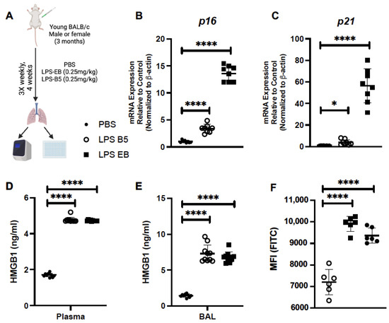Treatment of Young Mice with Low-Dose LPS Induces HMGB1 Production. (A) Experimental layout for LPS injections in young adult BALB/c mice (3 months). Lung tissue was collected from control and treated mice. (B,C) p16 and p21 expression in young lung in response to low-dose LPS administration. (D) Plasma and (E) BAL was isolated and HMGB1 was assessed. (F) β-galactosidase hydryolysis in young lung in response to senolytic treatment was assessed by flow cytometry. N = 6 mice per group, and the experiment was repeated 3 times. * p < 0.05, **** p < 0.0001. Figure 6A was created using BioRender.