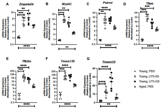 Treatment of Young Mice with Low-Dose LPS Alters Senescence Gene Expression in Lung. Lung tissue was collected from PBS-, LPS-B5-, and LPS-EB-treated young adult BALB/c mice (3 months of age). Expressions of (A) Zmpste24, (B) Mrpl43, (C) Polrmt, (D) Tfam, (E) Tf2m, (F) Tmem135, and (G) Tmem33 were assessed by real-time PCR. Aged (20 months) PBS-treated lung expression analysis is included for comparison. N = 6 mice per group, and the experiment was repeated 3 times. ** p < 0.01, *** p < 0.001, and **** p < 0.0001.