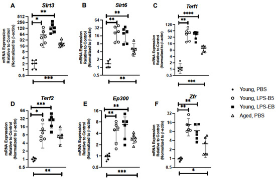 Given the importance of sirtuins 3 and 6 in modulating senescence, we evaluated if the expressions of these genes were altered in young lung in response to LPS administration. When compared to PBS controls, there was a significant increase in both Sirt3 and Sirt6 expression detected in lung collected from LPS-treated mice (Figure 8A,B). When compared to PBS-treated lung, there was an increase in Terf1 and Terf2 expression observed in young lung in response to LPS treatment (Figure 8C,D).We next examined the impact that low-dose, repeated LPS administration might have on DNA binding proteins, EP300, and ZFR. There was a significant increase in Ep300 and Zfr gene expression in young lung in response to LPS when compared to PBS controls (Figure 8E,F).