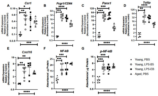 We next evaluated if repeated treatment with low-dose LPS could impact inflammatory gene expression in the young lung. In response to LPS, there was a significant elevation in Ccr1 expression in young lung when compared to PBS controls (Figure 9A). Given the importance of CD64, PANX1, TOLLIP, and CXCL16 to the immune response, we examined if the expressions of these genes were altered in young lung isolated from LPS-treated mice. When compared to PBS controls, there was a significant elevation of Cd64, Panx1, Tollip, and Cxcl16 detected in young lung in response to LPS-B5 and LPS-EB (Figure 9B–E). Based on these findings, we next investigated the impact of LPS-B5 and LPS-EB treatment on NF-κB and p-NF-κB protein expression in young lung. When compared to PBS-treated controls, there was a significant difference in NF-κB and p-NF-κB detected in young lung in response to LPS treatment (Figure 9F,G).