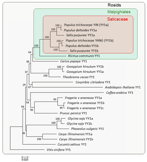 In order to analyze the phylogenetic position of YIN and YANG within the Rosids clade, and to estimate their gene duplication, we performed a phylogenetic analysis. The phylogenetic tree was constructed with 25 YY1 orthologues from 17 different plant species (Figure 1). Within the Salicaceae family, Populus (Populus trichocarpa), Populus deltoides, and Salix purpurea each have two copies of YY1 clustered in two groups. Group A includes YIN (PtYY1a), PdYY1a, and SpYY1a, while group B includes YANG (PtYY1b), PdYY1b, and SpYY1b. In contrast, Ricinus communis of the Euphorbiaceae, which is a sister family of the Salicaceae within the order of Malpighiales, has only one copy of YY1. This is in line with the assumption that the duplication of YY1 in the Salicaceae family and clustering in two groups is a result of the “salicoid” WGD that occurred 60–65 million years ago [6]. Although other species of the Rosids clade carry also two or even three YY1 copies, all these duplications occur later and independently of the “salicoid” WGD (Figure 1).