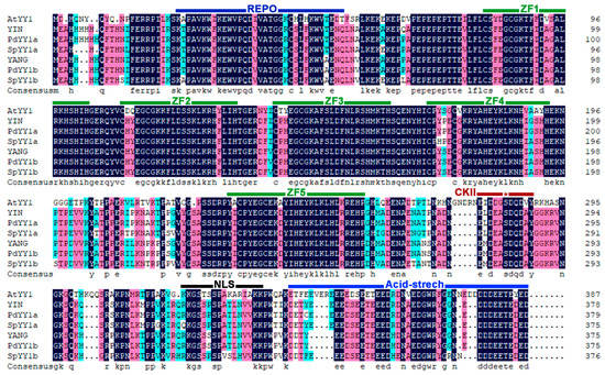 Sequence alignment and prediction of conserved domains in YY1 homologs of the Salicaceae family and AtYY1. The amino acid sequences were aligned with DNAMAN, modified. The REPO domain [23] is marked in dark-blue, the Zn-finger domains (ZF) are marked by green lines, the CKII phosphorylation site (CKII) by a red line (the asterisk marks the phosphorylated amino acid), the NLS by a black line, and the C-terminal acid-stretch by a line in ultramarine. Identical and similar amino acid residues are shaded with dark-blue, pink, and light-blue, respectively. AtYY1, Arabidopsis thaliana; YIN, YANG, Populus (Populus trichocarpa); PdYY1a,b, Populus deltoides; SpYY1a,b, Salix purpurea.