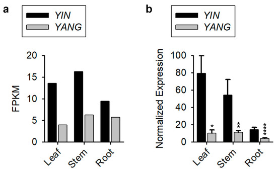 Expression of YIN and YANG in different tissues of Populus (Populus trichocarpa). (a) Published expression data of YIN and YANG in leaf, stem, and root from the Website (phytozome-next.jgi.doe.gov, accessed on 4 August 2022). (b) RT-qPCR data of YIN and YANG expression in leaf, stem, and root of 30 days old Populus (wild-type) plants cultivated in bottles. Data represent the mean ± standard error (SE) from three biological replicates (N = 3), and PtActin 7 was used as internal control. Note that the plants for the tissue samples continually grew on media with low IBA concentrations. The asterisks indicate significant differences between YIN and YANG expression (Student’s t-test: * p ≤ 0.05, ** p ≤ 0.01, and **** p ≤ 0.0001).
