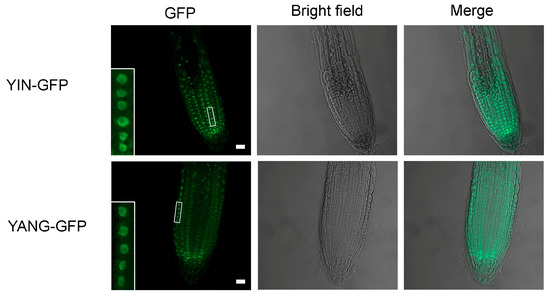 To analyze the subcellular localization of YIN and YANG, YIN-GFP and YANG-GFP were observed in transgenic 35S::YIN-GFP or 35S::YANG-GFP Arabidopsis seeding roots using a confocal laser scanning microscope (LSM 700, Zeiss, Jena, Germany) with a 488 nm excitation laser.