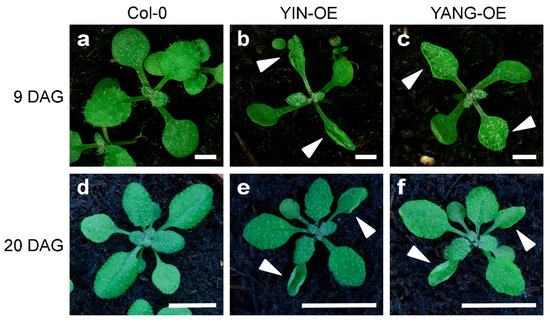 Vegetative phenotype of Arabidopsis YIN_OE and YANG_OE lines (T4 generation). The plants grew on soil for nine days (a–c; scale bars = 100 mm) or twenty days (d–f; scale bars = 1 cm), respectively. The overexpression of YIN and YANG caused up-curling of the primary leaves (arrowheads). Note that the leaf curling phenotype affected mainly juvenile leaves and was homogeneous mild in the T3 and T4 generation of all 10 transgenic lines (5 YIN_OE and 5 YANG_OE lines) which were used for all analyses in this study. However, some plants of the T1 generation showed stronger curling in almost all leaves (Supplementary Figure S3).