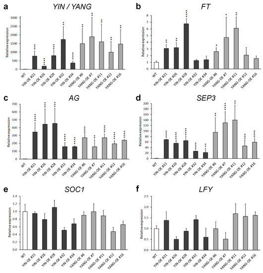 Constitutive expression of several flowering and flower development-related genes, including FT, SEP3, and AG, causes leaf curling and earlier flowering in Arabidopsis [34,35,36,37]. To assess the expression of these endogenous flowering and flower development regulating genes, we performed RT-qPCR assays (Figure 7). First, we tested the expression of the florigen and floral pathway integrator FT and found the expression levels of FT significantly upregulated in three YIN_OE (up to 6.7 TWE) and in three YANG_OE lines (up to 6.1 TWE), while four transgenic lines showed no significant differences of FT expression in comparison to wild-type (Figure 7b). Next, we tested the expression levels of SEP3 and AG and found both MADS-box genes highly misexpressed (Figure 7c,d). The expression levels of SEP3 ranged from 22.0 to 68.9 TWE in YIN_OE lines and 45.8 to 139.7 TWE in YANG_OE lines, while AG expression ranged from 158.0 to 453.6 TWE in YIN_OE lines and 157.6 to 271.8 TWE in YANG_OE lines. We found some a weak correlation between the expression levels of FT, SEP3, and AG in the transgenic lines. The three YIN_OE lines with significantly increased FT expression (#21, #26, #28), were also the three YIN_OE lines with the highest AG and SEP3 expression. Since FT was not significantly upregulated in all transgenic lines, we tested also the floral pathway integrators SOC1 and LFY (Figure 7e,f). Surprisingly, neither SOC1 nor LFY expression were significantly changed in any transgenic line tested compared with wild-type. To summarize our expression analysis, only AG and SEP3 were strongly misexpressed in all transgenic lines, while the slight upregulation of FT expression in some transgenic lines might be linked to high expression of AG and SEP3.