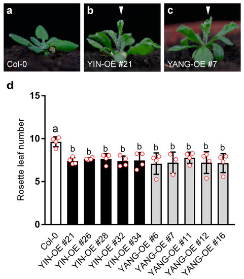 In four independent experiments (biological repeats), the rosette leaf number of 10 homozygous transgenic Arabidopsis lines (5 YIN_OE lines and 5 YANG_OE lines, all in T4 generation) and Col-0 was determined with 15 or more plants per line in each experiment. Statistical significance was determined by one-way ANOVA followed by a Tukey’s multiple comparisons test. The diagrams and graphs were generated using GraphPad Prism 7 Software (https://www.graphpad.com/scientific-software/prism/, accessed on 29 June 2022) and modified by Adobe Photoshop 8.0.