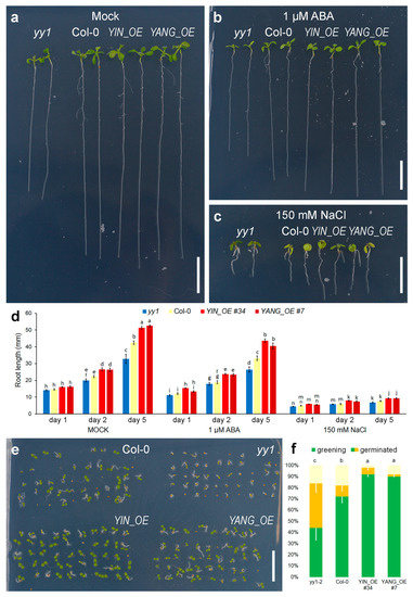 Exogenous application of ABA and NaCl can strongly reduce root growth in Arabidopsis plants [55]. Overexpression of AtYY1 results in enhanced root growth, which is mainly caused by negative regulation of ABA signaling [13]. Our transgenic YIN_OE and YANG_OE lines also exhibited decreased root growth inhibition sensitivity in response to ABA and NaCl (Figure 8a–d). After one day at 1 µM ABA, the root length of YIN_OE and YANG_OE plants were unaffected by ABA, while the wild-type root lengths were 83% of its mock control. Importantly, the root length of untreated Col-0, yy1 mutants, YIN_OE and YANG_OE plants did not significantly vary at day 1 of treatment. In contrast, NaCl treatment strongly reduced the root length of all genotypes, but YIN_OE and YANG_OE roots were more resistant than the wild-type. Over the time course (1, 2, and 5 days of treatment), the decreased root growth inhibition sensitivity of YIN_OE and YANG_OE plants to ABA and NaCl became more evident (Figure 8d). Therefore, expression of YIN_OE and YANG_OE made Arabidopsis plants less sensitive to ABA and osmotic stress. Similarly, seed germination and cotyledon greening ratio assays can indicate hypo- and hypersensitivity to ABA. YIN_OE and YANG_OE plants germinated earlier than the wild-type, while the yy1 mutant control germinated later (Figure 8e,f). To summarize, expression of YIN and YANG phenocopied the effects of AtYY1 overexpression on seed germination and root growth, suggesting an overlap of target genes between the transgenic YIN and YANG and the endogenous transcription factor AtYY1 in Arabidopsis. Since AtYY1 is a negative regulators of ABA responses, YIN and YANG might have a similar function in Populus.