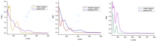 Complexes 1–3 were then analyzed by UV-visible spectroscopy, and their spectra were compared to those of the free ligands (Figure 1). Samples were dissolved in acetonitrile (80 µmol), and the absorbance was recorded from 200 to 800 nm (Figures S4–S6 in the ESI). Indicative of the formation of the desired chromium complexes, phenolate ligand-to-metal charge-transfer (LMCT) transitions were observed; these bands appeared at lower energies and with lower intensities with respect to the bands also found in the spectra of the corresponding free ligands and attributable to the π → π* transitions of the phenolic chromophores. In particular, the LMCT bands were observed at 416, 432, and 569 nm, respectively, for complexes salalenCrCl 2, salenCrCl 1, and salanCrCl 3.