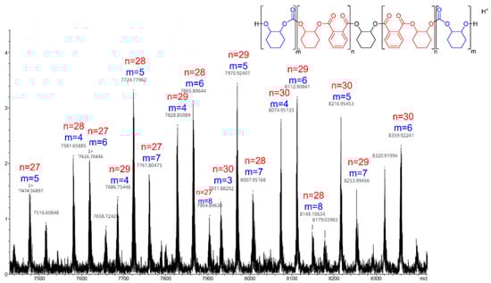 Expanded MALDI-ToF spectrum ranging from 7400 to 8500 m/z of the poly (cyclohexene phthalate-block-cyclohexene carbonate) obtained in entry 2 of Table 3.