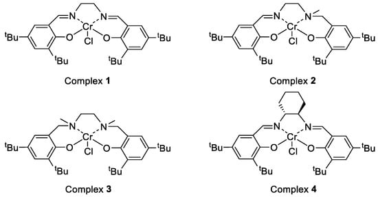 Chromium complexes 1–3 were synthesized according to a previously reported procedure []. The opportune proligand and one equivalent of chromium (II) chloride CrCl2 were dissolved in THF, and the solution was stirred at room temperature in a nitrogen atmosphere for 24 h (Scheme 1). After this time, the solution was exposed to the air for two hours to allow the oxidation of chromium (II) to chromium (III). The desired complexes were obtained by extraction with diethyl and a saturated solution of NaCl. The organic phase was dried with Na2SO4, filtered, and the solvent was removed in vacuo. In Scheme 2, the structures of complexes 1–3 are detailed, and the structure of the commercial complex 4 is also reported for comparison.