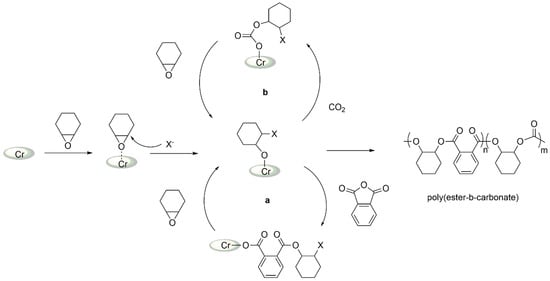 As depicted in Scheme 4, the copolymerization initiates with the activation of the epoxide by coordination to the Lewis acidic metal center, and the following nucleophilic attack of the initiating species X (e.g., the chloride ion from PPNCl) ring-open the monomer. The resulting metal alkoxide inserts a CO2 molecule (pathway b in Scheme 4), generating a metal carbonate. Therefore, the cycle propagates by alternate repetitions of CHO and CO2 insertions, leading to the formation of the polycarbonate products.