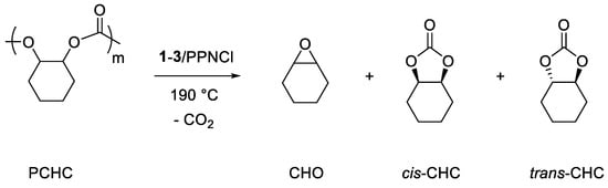 The most abundant PCHC sample (obtained in entry 2 of Table 1), whose thermal stability had been evaluated by TGA analysis (Td = 248 °C), was used to compare the performance of the synthesized complexes 1–3 in the depolymerization reactions (see Scheme 7), working under conditions similar to those explored by Lu []. Operating in bulk at 190 °C with 0.2 mol % catalyst loading and one equivalent of PPNCl (entry 1, Table 4), salanCrCl complex 1 promoted the almost full depolymerization of the PCHC sample (94% of conversion) with a selectivity of 97% versus the monomer (CHO) in only ten minutes.
