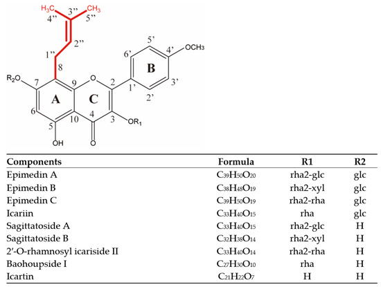 - Zhou, M.; Zheng, W.; Sun, X.; Yuan, M.; Zhang, J.; Chen, X.; Yu, K.; Guo, B.; Ma, B. Comparative analysis of chemical components in different parts of Epimedium Herb. J. Pharm. Biomed. Anal. 2021, 198, 113984. [Google Scholar] [CrossRef]