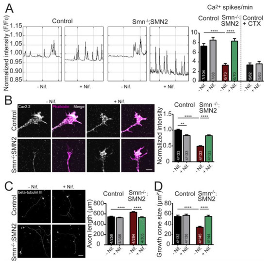 Proper formation of Cav2.2 clusters is essential for spontaneous Ca2+ transients during neuronal development [13]. Based on the observation that nifedipine treatment significantly improves Cav2.2 cluster-like formations and the frequency of spontaneous Ca2+ transients in motor axon terminals of SMA motor neurons, we hypothesized that other cellular differentiation defects are beneficially affected as well. Thus, the axonal outgrowth of nifedipine-treated motor neurons was examined at DIV7. As previously shown, the axon length of SMA motor neurons was significantly different from those observed in control motor neurons [13]. However, nifedipine treatment significantly decreased the axon elongation of SMA motor neurons on laminin-221/211 control levels (Figure 1C). Similarly, the growth cone size was markedly increased upon nifedipine treatment of SMA motor neurons at DIV5 (Figure 1D). In contrast, in control motor neurons, the addition of nifedipine did not affect growth cone size and axon elongation, respectively (Figure 1C,D).