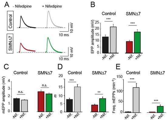 Nifedipine increases neurotransmission in rat, mouse, and frog motor nerve terminals in a Ca2+-dependent manner during postnatal maturation [24,25]. Here, we investigated whether nifedipine could do so at mouse motor nerve terminals of the SMA, highly vulnerable muscle transversus abdominis (TVA) at a time (postnatal day 9–11, P9–11) in which the electrophysiological alterations were already significant [18,31].