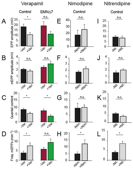 Nifedipine increases neurotransmission independently of its blocking effect on Ca2+ entry through L-type Ca2+ channels in postnatal mice. (A–D) Effect of verapamil (Ver., 3 µM), (E–H) nimodipine (Nim., 10 µM), and (I–L) nitrendipine (Nit., 50 µM) on EPP size (A,E,I), mEPP size (B,F,J), quantal content (m) (C,G,K), and mEPP frequency (D,H,L) in control terminals, except for verapamil that was also tested in SMA terminals (* p < 0.05; two-tailed Student’s t-test).