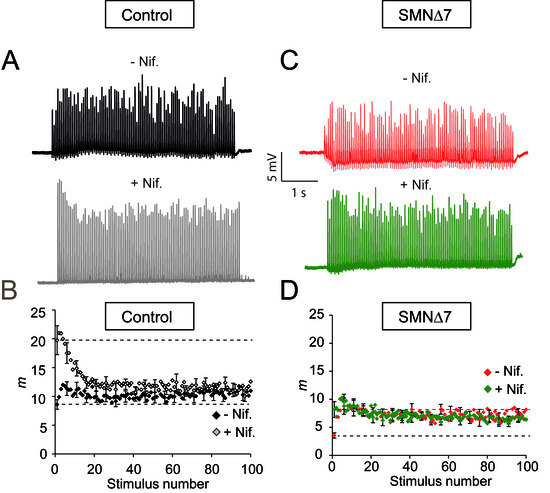 In summary, nifedipine restored the reduced spontaneous calcium influx through N-type voltage-gated Ca2+ channels in embryonic SMN-deficient motoneurons by increasing cluster formation of the channels. These increased spontaneous Ca2+ transients correlated with enhanced cellular differentiation in terms of axonal growth. Moreover, our ex vivo studies showed that nifedipine improves low-frequency evoked and spontaneous neurotransmission in SMN-deficient motor nerve terminals.