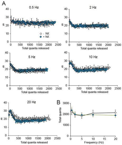 2.5. The RRP Pool Size Is Insensitive to Nifedipine in Adult Motor Nerve Terminals