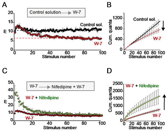 Effect of W-7 on secretion during repetitive high-frequency stimulation. (A) Average quantal content (m) in the absence (control solution) and presence of the CaM inhibitor W-7. Observe the increases in short-term depression (STD). (B) Mean cumulative release from recording in (A). (C) Average quantal content in the presence of W-7 and after adding nifedipine. (D) Mean cumulative release from recording in (C). The arrows represent the directions and amplitudes of the changes.