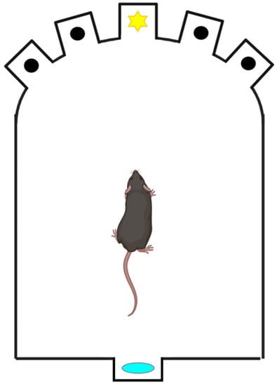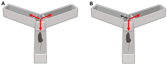 Y-maze test. Working memory is evaluated by measuring spontaneous alternation. In (A), red arrows correspond to the normal consecutive exploration of all three arms. In (B), the black arrow shows the corresponding arm’s low exploration, indicating spontaneous alternation and working memory problems.
