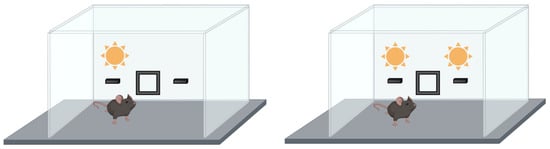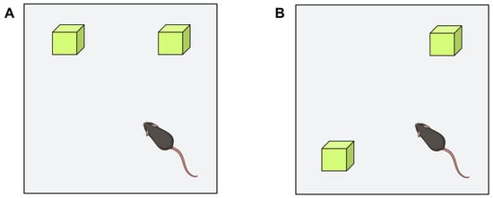 Object location test used to evaluate the spatial memory. During the habituation phase (A), mice are invited to explore the two objects located in the open field. After a resting period, mice are re-exposed to the same arena by changing the position of one of the objects (B) and measuring the exploration time of each one.