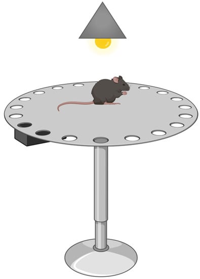 Barnes maze. The animal is first positioned in the center of the apparatus and then allowed to explore the various orifices upon exposure to aversive stimuli, such as lights and sounds. The time it takes to find the exit leading to the refuge box is evaluated.