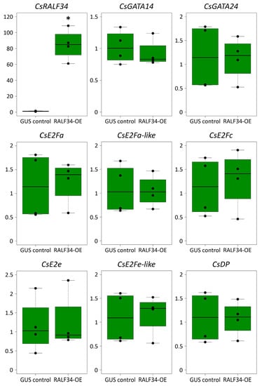 2.3. Overexpression of CsRALF34 Does Not Affect the Expression of CsGATA14, CsGATA24, and CsE2F/DP Genes