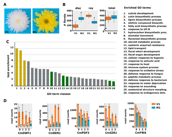 Phenotypic characterization of a spontaneous chrysanthemum mutant with decreased disc:ray floret ratio. (A) Top view of a mature capitulum from variety 1 (V1; left) and its spontaneous mutant (M1; right) that showed a strong increase in the number of disc florets and yellow instead of white ligules. (B) Boxplot showing the number of disc and ray florets and the total number of florets in V1 and M1 capitula (n = 7). (C) GO-term enrichment analysis with the DEGs of M1 vs. V1 at stages 0 and 1. The legend for the category numbers is displayed on the right. The y-axis displays the fold enrichment of the number of genes in the category compared to the Arabidopsis genome; the x-axis displays the different significantly enriched categories (FDR < 0.05). The categories discussed in the text are displayed in yellow and green. (D) Expression plots for five selected genes from the RNA-seq experiment (RPKM read count values are displayed). The transcript identifiers are as follows: CmDWF1, DN96938; CmBEN1, DN45086; CmPDF2, DN65126; CmGIR1, DN43323; and CmFWA, DN60377. The numbers at the x-axis indicate the stages. Error bars indicate the SE of the three biological replicates; asterisks indicate significance at Padj < 0.01.