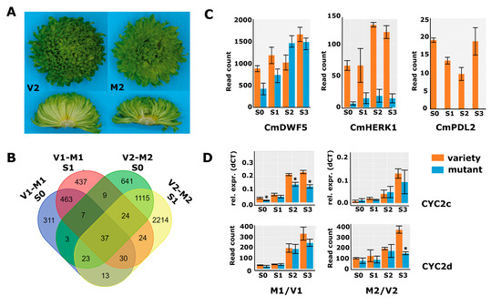 DEG analysis in a second genetic background. (A) Pictures of variety 2 (left panels) and mutant 2 (right panels) of a complete inflorescence (top) and transversely sectioned inflorescence (bottom). (B) Overlap of DEGs between V1/M1 and V2/M2 in stages 0 and 1. (C) Read count data from the second RNA-seq experiment (V2/M2) for CmDWF5 (DN57668), CmHERK1 (DN68032), and CmPDL2 (DN38497). (D) qPCR data for CYC2c and read count data for CYC2d from both RNA-seq experiments (V1/M1 left; M2/V2 right). Error bars indicate SE; asterisks indicate significance (qPCR: p < 0.05; RNA-seq: Padj < 0.01).