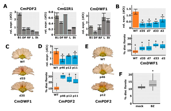 Functional characterization of CmPDF2, CmGIR1, and CmDWF1. (A) qPCR analysis of CmPDF2, CmGIR1, and CmDWF1 expression in different tissues. B1, bud stage 1; DF, mature disc florets; RF, mature ray florets; L, leaf; St, stem. (B) Downregulation of CmDWF1 transcripts in different RNAi lines (top panel) and the quantification of the corresponding capitulum phenotypes (bottom panel) (C) Transverse sections of the capitula of two lines with CmDWF1 downregulation compared to the WT (top). A higher number of disc florets is visible in the center of the transgenic capitula. (D) Downregulation of CmPDF2 transcripts in different RNAi lines (top panel) and the quantification of the corresponding capitulum phenotypes (bottom panel). (E) Transverse sections of the capitula of two lines with CmPDF2 downregulation compared to the WT (top). A higher number of disc florets is visible in the center of the transgenic capitula. (F) Brassinozole treatment of WT inflorescence buds results in a higher number of disc florets. Error bars indicate SE; asterisks indicate significance (qPCR: p < 0.05; RNA-seq: Padj < 0.01).