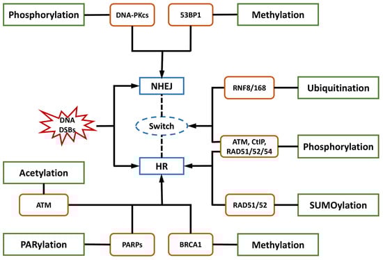 HR is orchestrated by several PTMs with elaborate primary mechanisms. The first one is phosphorylation. Switching the meiotic recombination mode of HR was reported to occur by the phosphorylation of RAD54 and HED1, downregulating RAD51 activity by suppressing Rad51/Rad54 complex formation [,]. Secondly, SUMOylation is important in HR. It affects all steps in HR and exerts various regulatory functions on substrates []. Evidence indicated that SUMOylation induced by topoisomerase 1-binding arginine/serine-rich protein (TOPORS) was essential for the recruitment of RAD51 to the damaged sites and the support of HR repair, maintaining genomic stability []. On the other hand, NHEJ might be associated with phosphorylation and methylation by DNA-PKcs and 53BP1, respectively.