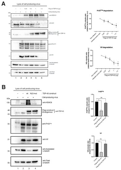 To ascertain the effect of TDP-43 on HIV-1 viral production and virion infection capacity, we first studied the expression and effect of TDP-43 on HDAC6 in a well-accepted cell model for studying the HIV-1 infection cycle, such as viral particle production, as previously reported [,]. We characterized the effect of two TDP-3 constructs that have previously been assayed on HIV-1 infection studies [] and well characterized in other biological functions [,,,,]: a full-length N-terminal Flag-tagged, wild-type TDP-43 construct (Flag-wt-TDP-43), and an N-terminal Flag-tagged nuclear localization signal (NLS) mutant (Flag-NLS-mut-TDP-43) that lacks the NLS domain of the protein [,,,,], as we previously characterized in HIV-1 studies []. We observed that the overexpression of the full-length TDP-43 construct increases and stabilizes the level of expression of the tubulin-deacetylase HDAC6 (Figure 1A, western blot line 2, quantified in the associated histograms on the right), which provokes a decrease in the levels of acetylated α-tubulin in stable MTs (Figure 1A, western blot line 2, quantified in the associated histograms on the right), a main substrate of the enzyme. The over-expression of the NLS-mut-TDP-43 construct did not affect the level of expression of the HDAC6 enzyme, and no significant changes were seen in the levels of acetylated α-tubulin on MTs (Figure 1A, western blot line 3, quantified in the associated histograms on the right).