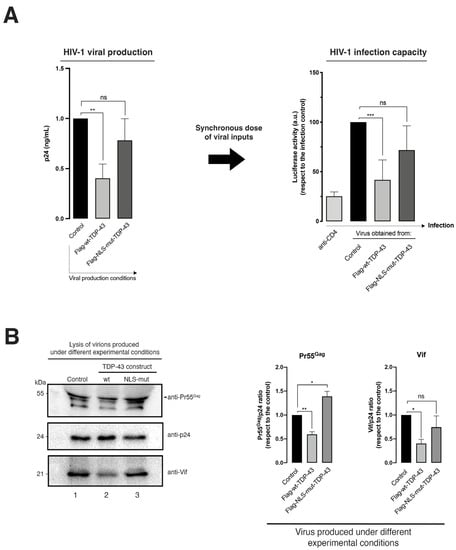Therefore, this TDP-43-mediated degradation of Pr55Gag (Figure 2) could account for the inhibition of viral particle production observed under this experimental condition (Figure 3A, HIV-1 viral production histogram), whereas the clearance of Vif (Figure 2) could negatively affect the infectious capacity of produced HIV-1 virions (Figure 3A, data on the HIV-1 infection capacity histogram), as previously reported for HDAC6 [,]. The infectious capacity of HIV-1 virions was assayed by infecting permissive CEM.NKR-CCR5 CD4+ T cells with synchronous doses of viral particles produced in HEK-293T cells overexpressing wt-TDP-43 (Figure 3A, data on the HIV-1 infection capacity histogram). This TDP-43 anti-HIV-1 effect was not observed by using the NLS-TDP-43 mutant (Figure 3A, see NLS-TDP-43 mutant associated data), which in turn had no effect on Vif and Pr55Gag viral proteins (Figure 2B, western blot line 4, quantified in associated histograms on the right).