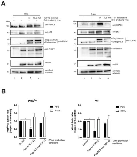 Moreover, it has been reported that TDP-43 overexpression reduces the release of the HIV-1 p24 antigen in HeLa cells co-transduced with HIV-1 pro-viral DNA []. The authors used an in vitro transcription assay to observe that in the presence of recombinant TDP-43, HIV-1-LTR DNA transcription is repressed. However, the ability of TDP-43 to impair HIV-1-LTR DNA transcription has not been analyzed in HeLa cells, for example, by quantitatively measuring pro-viral mRNA production. Although this possibility might not be ruled out, the results obtained in our work point in another direction. We observed that the overexpression of functional TDP-43 does not reduce the level of expression of HIV-1 Pr55Gag and Vif proteins when the autophagy-mediated clearance of Pr55Gag and Vif proteins is inhibited by 3-MA treatment in virus-producing cells. Therefore, TDP-43 did not appear to affect HIV-1-LTR DNA transcription under our experimental conditions. These data suggest that the anti-HIV-1 action of TDP-43 is mainly exerted by regulating the mRNA and enzyme levels of the antiviral factor HDAC6.