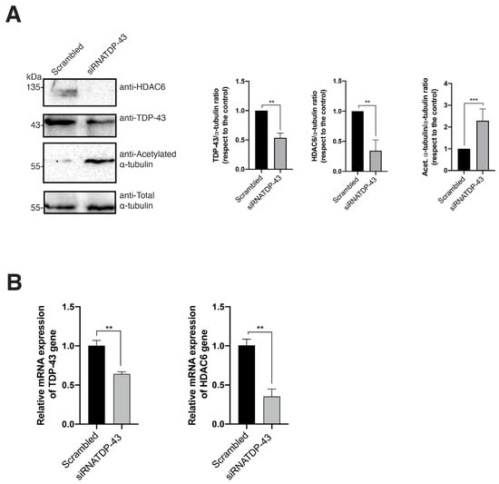 Specific TDP-43 mRNA silencing diminishes mRNA and protein levels of HDAC6. (A) The biochemical western blot analysis of endogenous TDP-43 and HDAC6 protein expression levels in HEK-293T cells transfected with a mix of siRNA oligonucleotides (siRNA-TDP-43 (B + C)) against TDP-43 (siRNATDP-43 experimental condition) or the control, which was scrambled-treated cells. The HDAC6 subtract acetylated α-tubulin in MTs is shown. Total α-tubulin for protein load control is shown under each experimental condition. Data are represented as the mean ± S.E.M. of three independent experiments (see replicate data in Figure S6, Supplementary Materials section). Histograms show the quantification of western blot bands for the TDP-43/, HDAC6/, and acetylated α-tubulin/α-tubulin ratio under this experimental condition. Data associated with the quantification of replicates are shown in Figure S6, Supplementary Materials section). (B) The relative quantification of TDP-43 and HDAC6 mRNA by RT-qPCR (3 replicates) is represented in histograms in siRNA-TDP-43-treated HEK-293T cells or the control, which was scrambled-treated cells. In (A,B), when indicated, ** p < 0.001 and *** p < 0.001 are the p values for Student’s t test.