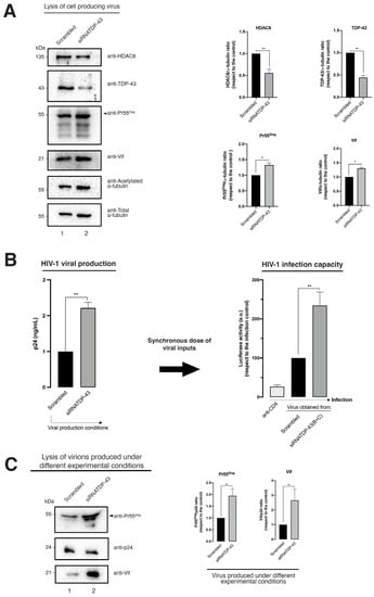 Furthermore, specific TDP-43 knockdown leads to an increase of the expression level of the HIV-1 Vif and Pr55Gag proteins in virus-producing HEK-293T cells (Figure 7A). Likewise, viral production was strongly increased under this experimental condition (Figure 7B, HIV-1 viral production histograms), thereby observing that released virions were more efficiently infecting permissive CD4+ T cells than those produced in the control, which was scrambled-treated HEK-293T cells (Figure 7B, HIV-1 infection capacity histograms). These observations could be associated with the enhancement on the expression levels of Pr55Gag and Vif (Figure 7A). In fact, the biochemical analysis of the viral content on Pr55Gag and Vif proteins of synchronous doses of cell-free viral particles produced in siRNA-treated HEK-293T cells indicated that Vif and of Pr55Gag are better incorporated in nascent virions in cells lacking the TDP-43 protein compared to control cells (scrambled-treated cells) (Figure 7C). These data suggest an anti-HIV-1 action of the endogenous TDP-43 (i.e., TDP-43/HDAC6 axis) in control conditions, which is lost after TDP-43 silencing, leading to a concomitant diminution of the antiviral HDAC6 enzyme and a subsequent increase of the HIV-1 Vif and Pr55Gag proteins (Figure 7A).