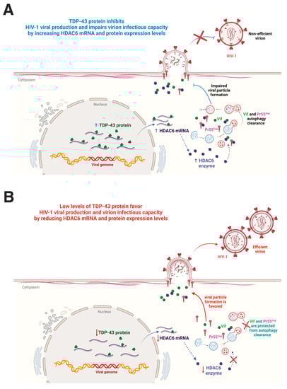 Scheme summarizing the TDP-43 control of HIV-1 viral particle production and virus infectiveness. (A) The overexpression of functional TDP-43 leads to an increase of HDAC6 mRNA and protein levels, which promote the autophagic clearance of HIV-1 Pr55Gag and Vif proteins, thereby inhibiting viral particle production and virus infectivity. These viral particles incorporate a reduced amount of HIV-1 Pr55Gag and Vif proteins. (B) Endogenous TDP-43 silencing reduces HDAC6 expression (i.e., mRNA and protein), stabilizes HIV-1 Vif and Pr55Gag proteins, and favors their incorporation into virions, thereby promoting HIV-1 viral particle production and infectious capacity. Thus, there is a direct relationship between the content of HIV-1 Vif and Pr55Gag proteins in virions and their infection capacity. Therefore, TDP-43 (i.e., the TDP-43/HDAC6 axis) could be considered a key factor to control HIV-1 viral production and virus infectiveness. Designs and templates were created with BioRender.