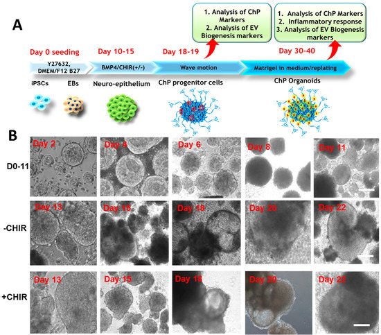 ChP organoid differentiation from hiPSCs. (A) Illustration of ChP differentiation; (B) the ChP organoid morphology for CHIR+/− conditions during the differentiation. Scale bar: 200 µm. BMP: bone morphogenetic protein; EBs: embryoid bodies. EV: extracellular vesicles.