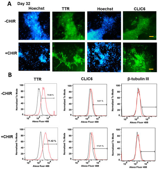 During the ChP organoid development, the spheroids were imaged every 2–3 days prior to media change to assess the growth and morphology of the ChP organoids (Figure 1A). The spheroids increased in size from ~300 µm at day 3 to ~1200 µm after day 22, and the size was comparable for the two groups (CHIR+/−) (Supplementary Figure S1). However, the CHIR+ groups in general had 2–3-fold more spheroids than the CHIR− group by day 30, possibly due to the stimulated proliferation by Wnt activation, based on the amount of total mRNA isolated (1.82 ± 0.47-fold for CHIR+/CHIR− ratios) (Supplementary Figure S2). The ChP organoids were enriched with cuboidal epithelium. Cysts containing a colorless fluid (fluid filled compartments), a notable feature of ChP organoids, were visible after day 18 of development for both conditions (Figure 1B). On day 32 of development, immunostaining was performed for the intracellular markers of replated ChP organoids, CLIC6 and transthyretin (TTR) (Figure 2A). The positive expression levels of CLIC6 and TTR were observed for both conditions. Since the nuclear staining showed some granules, a LIVE/DEAD assay was performed, and the dead cells were present in the replated organoids (Supplementary Figure S3). On day 30, flow cytometry was performed for the dissociated ChP organoid cells in order to quantify the ChP markers TTR and CLIC6 (Figure 2B and Supplementary Figure S4). For TTR, about 71–74% of expression was observed, while CLIC6 displayed 8–17% of expression (17.2% vs. 8.2% for CHIR+ vs. CHIR− group, respectively). Compared to the CHIR− condition, the CHIR+ condition had a ~10% higher CLIC6 expression, while the TTR expression was comparable. The general neuronal marker β-Tubulin III showed little expression for both CHIR+/− conditions, indicating that the derived ChP organoids contained few neuronal cells.