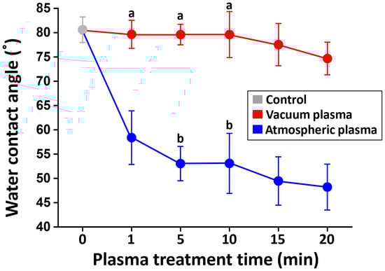 Changes in water contact angles as a function of plasma treatment time with atmospheric plasma and with vacuum plasma. The contact angle decreased with increasing treatment time for both plasma systems. The means within each plasma system that share identical letters are not significantly different from each other (p > 0.05).