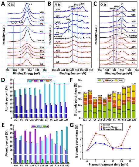 XPS spectra correspond to the C1s (A), N 1s (B), and O 1s (C) regions of all experimental groups. (D) Chemical composition obtained from SEM-EDS analysis. (E) Atomic percentages of C, N, and O on the zirconia surfaces were obtained from XPS spectra. (F) The relative ratios of lattice oxygen (OL), OH(a), and OH(b) in the O 1s core level XPS spectra. (G) N atomic percentage as a function of plasma treatment time obtained by XPS analysis.