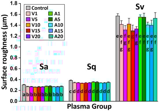 The surface texture parameters (Sa, Sq, and Sv) of all test groups. No significant differences in Sa, Sq, and Sv were observed among all plasma-treated groups. Means with identical letters are not significantly different from each other (p > 0.05).