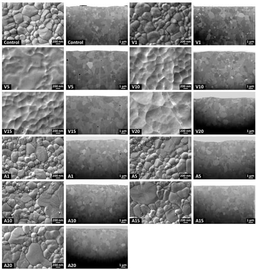 SEM micrographs (Figure 4) showed that the degradation of the grain boundaries under high electric fields occurred in the vacuum plasma groups. The SEM images also revealed surface erosion due to energetic ion bombardment from high-power pulsed plasma streams. However, as shown in cross-sectional focused ion beam (FIB) images, those changes were confined to the outermost surfaces (top 10 nm), and the plasmas did not cause any subsurface damage in all experimental groups. In contrast to vacuum plasmas, the grain boundaries were clearly seen, and some small particles on the grain boundaries were observed at longer exposure times with atmospheric plasmas.