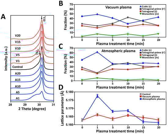 The X-ray diffraction (XRD) data were analyzed by the Rietveld method. As shown in Supplementary Figures S2 and S3, the Rietveld refinement results showed that all experimental groups were composed of four different crystalline phases: tetragonal’, tetragonal, cubic, and monoclinic phases. The crystal structures of each phase are shown in Supplementary Figure S4. To investigate the phase evolution affected by the plasma treatment conditions, the XRD patterns of all experimental groups in the 2θ range of 27° to 31° are depicted in Figure 5A. Asymmetrical broadening and a decrease in the intensity of the tetragonal peak (011)t can be observed in the A1 and V1 groups, suggesting a superposition of two peaks (the tetragonal peak (011)t at 2θ = 30.17° and the cubic peak (011)c at 2θ = 30.07° (JCPDS card 27-0997) []. The quantitative phase composition as a function of the exposure time, deduced from the Rietveld analysis, is shown in Figure 5B,C. The control group mainly consisted of tetragonal and cubic phases. In the Rietveld refinements, the cubic phase fraction significantly increased after 1 min of plasma exposure and was further reduced to a control level with increasing exposure times. Figure 5D shows the change in the unit cell parameter (Å) of the cubic phase as a function of the plasma exposure time, and the highest increase in unit cell volume was observed in the A1 group.