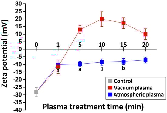 Changes in zeta potential as a function of the plasma treatment time with atmospheric plasma and with vacuum plasma. The zeta potentials of control, atmospheric plasma groups, and V1 are negative, while those of the vacuum plasma groups except V1 are positive.