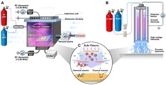 Schematic diagrams of experimental setups for plasma surface modifications: (A) ICP vacuum plasma system, (B) DBD atmospheric plasma system, and (C) mechanism of the plasma surface modification of 3Y-TZP.