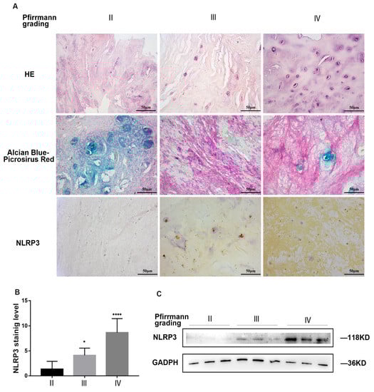 We collected NP tissue samples from 20 cases (Table 1) and measured the expression of NLRP3 in each specimen. Hematoxylin and eosin (HE) staining revealed that the NPCs tended to concentrate as numerous spherical units surrounded by an abundant ECM (Figure 1A). The proteoglycan (blue) and collagen (red) concentrations in the NP tissues were assessed histologically using Alcian blue and Picrosirius red [,]. As shown in Figure 1A, with the grade of IVDD, the collagen staining area (red) of the NP tissues increased, while the proteoglycan area (blue) decreased. According to immunohistochemistry (IHC) and Western blot (WB) assays, the expression of NLRP3 was proportional to the grade of IVDD (II: 1.583 ± 1.504, III: 3.833 ± 1.407, and IV: 8.5 ± 2.505, Figure 1A–C). These findings suggest that the activation of the NLRP3 inflammasome occurred during IVDD.